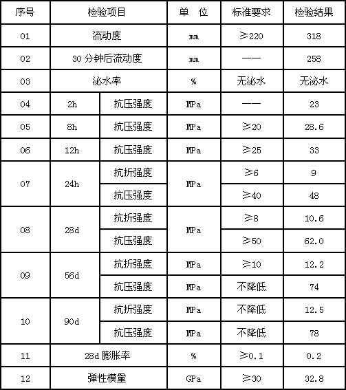 其性能指標(biāo)符合《京滬高速鐵路高性能混凝土施實(shí)施細(xì)則》與《客運(yùn)專線橋梁盆式橡膠支座暫行技術(shù)條件》等國(guó)家與鐵路行業(yè)標(biāo)準(zhǔn)技術(shù)要求。具有優(yōu)異的流動(dòng)性,自流找平,不需振搗,抹壓,施工速度快、方便;具有非常高的小時(shí)強(qiáng)度、后期強(qiáng)度高,不收縮;根據(jù)不同的施工溫度,2小時(shí)即可獲得20-40Mpa的抗壓強(qiáng)度,抗折強(qiáng)度高;具有微膨脹性能及優(yōu)異的抗開裂性能;適應(yīng)溫度范圍寬,在-5℃~-35℃條件下,無(wú)需任何輔助保溫或降溫措施都可施工;在高溫或低溫條件下,能夠同時(shí)保證強(qiáng)度發(fā)展和施工流動(dòng)性的需要。